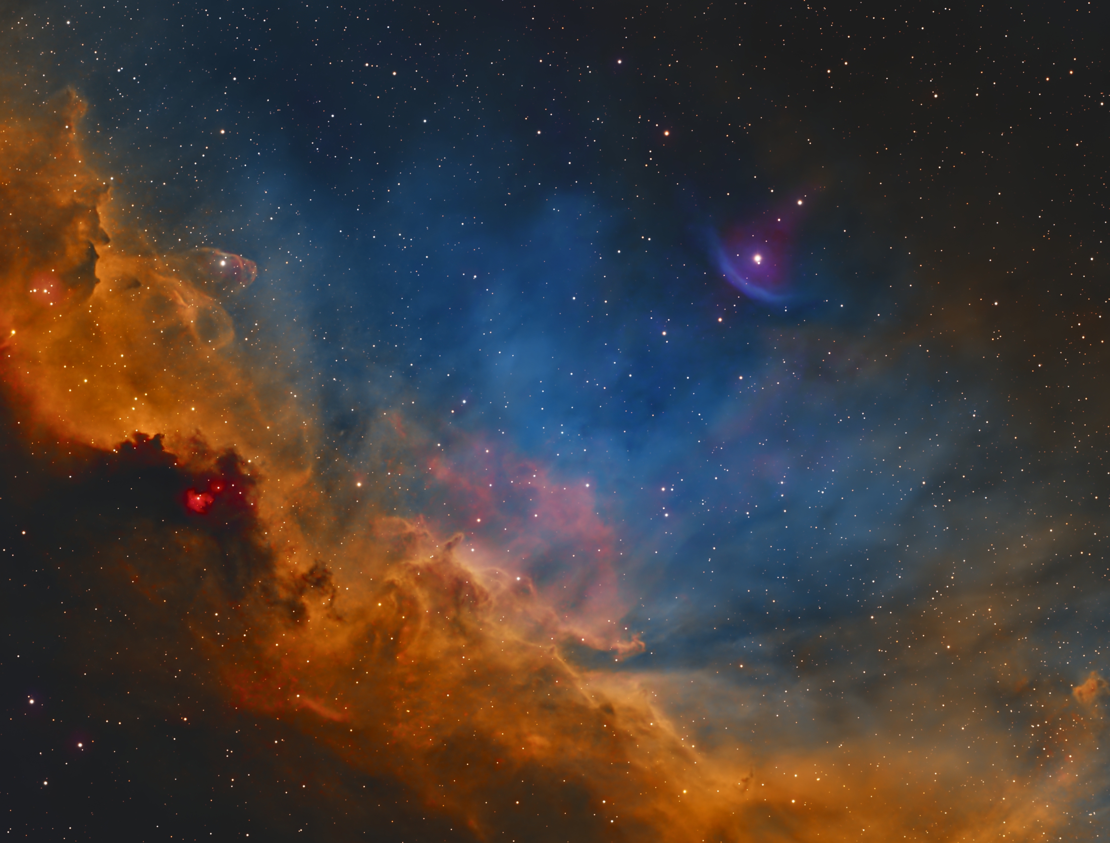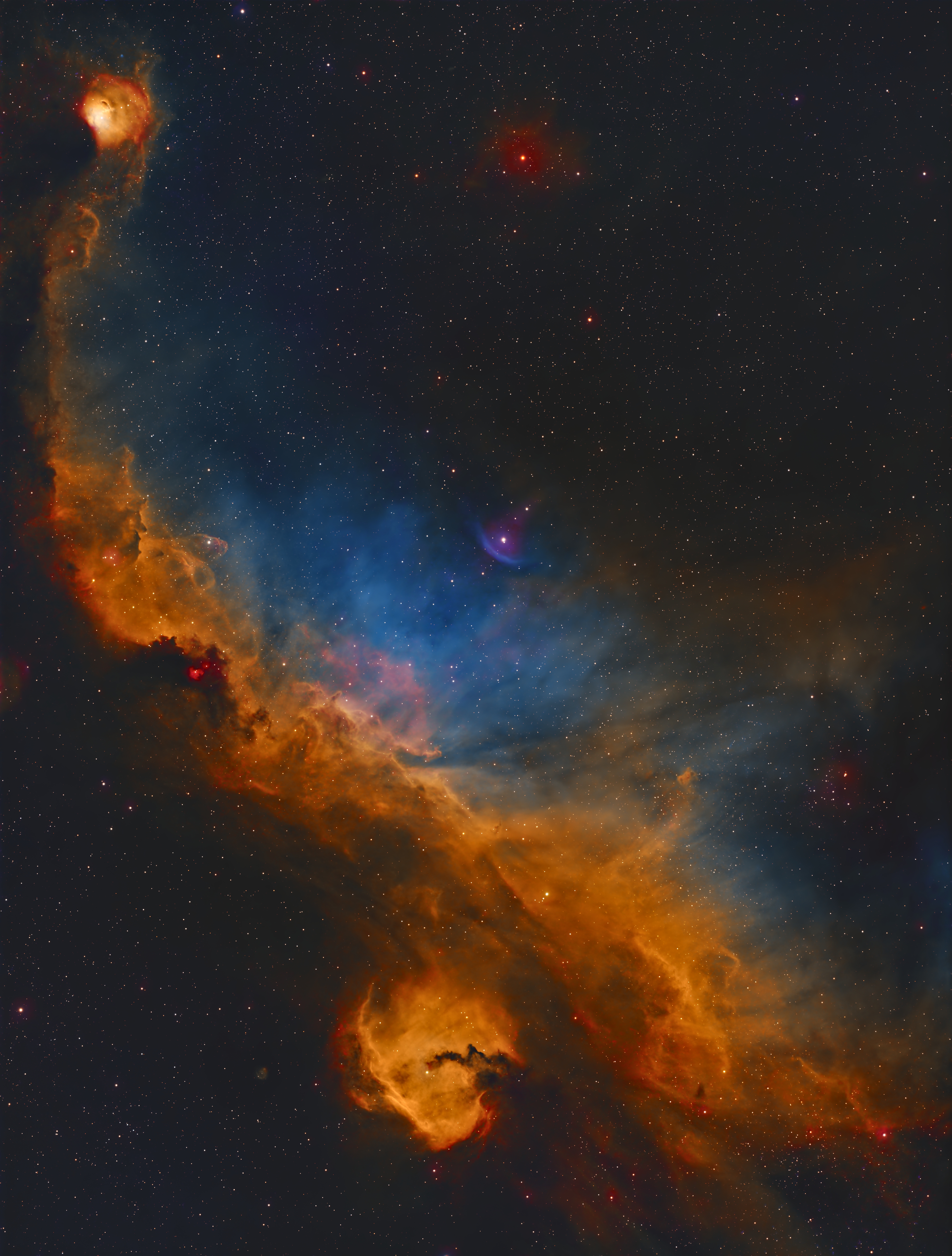 This stunning, turbulent cloud of dust is full of sulphur (SII), hydrogen (Ha), and oxygen (OIII) gases. I’ve processed the image using the “Hubble Palette,” where sulphur is shown in red, hydrogen in green, and oxygen in blue—a style you might recognize from those iconic Hubble Space Telescope photos.